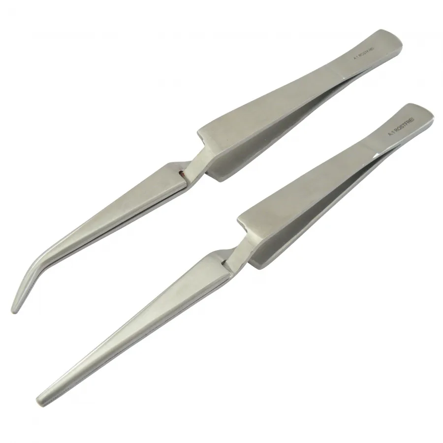 - Selbsthaltende Pinzette, gerade, Länge 16 cm und selbsthaltende Pinzette, gebogen, Länge 16 cm